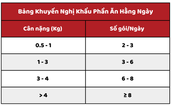 Khẩu phần ăn hàng ngày có thể được điều chỉnh tùy theo kích thước, cân nặng, độ tuổi và mức độ vận động của mèo. Bảo quản thức ăn ở nhiệt độ phòng. Luôn cung cấp nước cho mèo thường xuyên.
