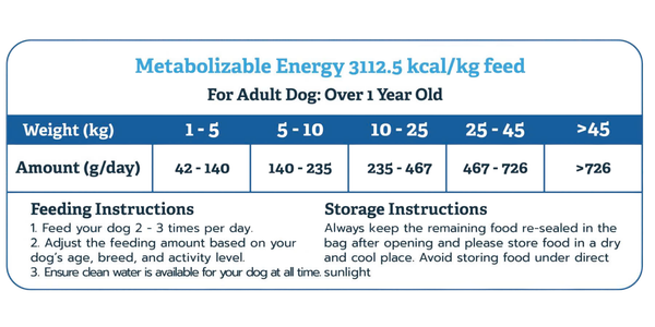 Bột gia cầm, bột sắn, bắp, gạo, dầu cọ, đạm động vật, mỡ gia cầm, bột cá, hỗn hợp vitamin bổ sung, hỗn hợp khoáng bổ sung, muối, kali clorua, choline clorua, dầu cá hồi, dầu cám gạo, men vi sinh, FOS, methionine, chiết xuất yucca schidigera, hương vị cá hồi, hỗn hợp tocopherol tự nhiên, bột nam việt quất, bột cà rốt, bột hỗn hợp các loại quả mọng, bột rau bina, bột bí đỏ