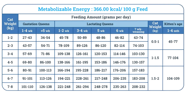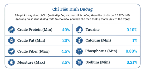 Bột gia cầm, bột gluten bắp, gạo, dầu cọ, mỡ động vật tinh luyện, lúa mì, đạm động vật thủy phân, bột cá, dầu cá hồi, mỡ gia cầm, chất xơ – cellulose, dicalcium phosphate, dầu hướng dương
